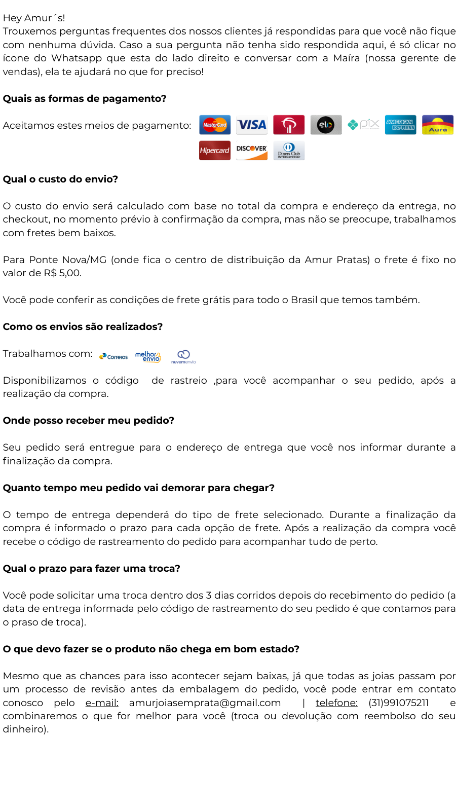 Para Ponte Nova/MG (onde fica o centro de distribuição da Amur Pratas) o frete é fixo no valor de R$ 5,00.